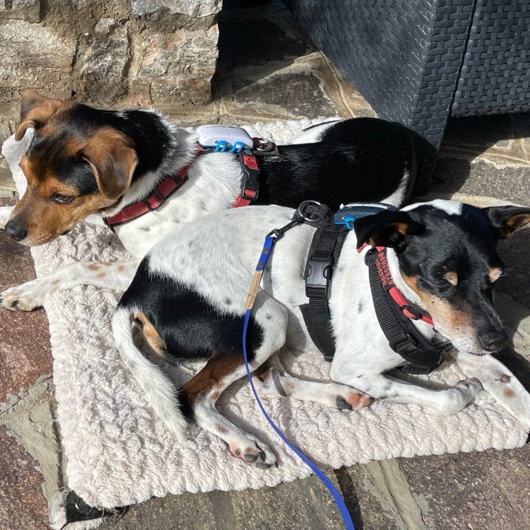 Elmo ist unser Seniorhund, jetzt etwa 12 Jahre alt. Ein typischer Ratonero Bodeguero Andaluz, übernommen vom BMTV e.V., dem Franziskus Tierheim Hamburg. Über seine spanische Vergangenheit wissen wir nichts, irgendwie ist er ins Tierheim in Barcelona geraten. Seine Narben trägt er äußerlich wie innerlich mit Fassung. Er wird allmählich altersstarrsinnig, ist aber fit wie ein Turnschuh und immer noch der Chef im Haus. Die beiden sind inzwischen gleich schnell, nur springen kann Cnut jetzt höher. Sie sind sich in vielem einig, raufen gelegentlich miteinander und schätzen sich und ihren jeweils eigenen Liegeplatz. Zusammen trainieren finden sie toll, einer ist dran und einer wartet.