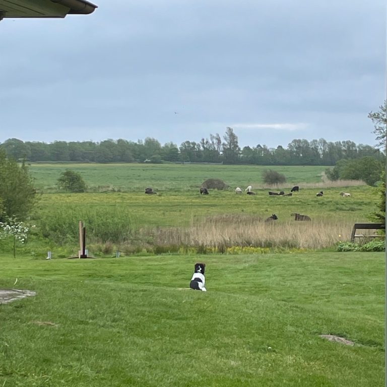 Elmo sucht mit Begeisterung stundenlang Mäuse, während Cnut in der Mitte des Rasens sitzt und einfach nur so guckt. Entspannter dänisch-schwedischer Hofhund. Die Mäuse jagt der Ratonero.
